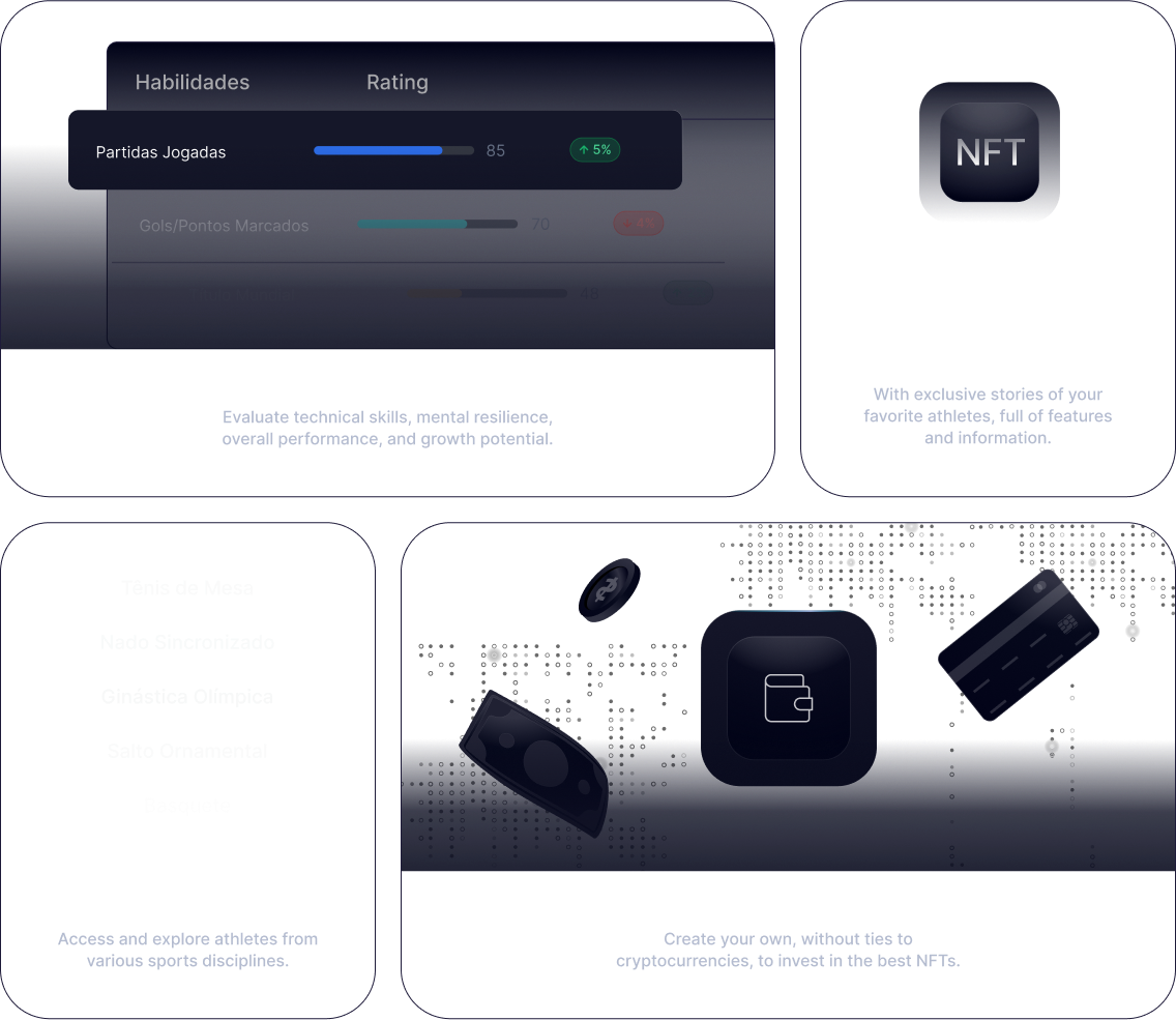 Acompanhe o desempenho do seu atleta favorito, com NFTs dinâmicos e adicione à sua Wallet os ativos digitais de cada temporada. Invista e colecione a história. Comece agora, é rápido e fácil.